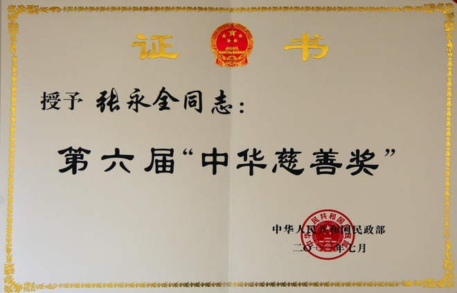 公司董事長張永全再次榮獲第六屆中華慈善獎愛心捐贈個人,這是董事長第三次獲得該獎項。該獎項獲獎人員全國共20人。7月15日,公司董事張玉鳳代表董事長赴京參會,并得到溫家寶總理等國家領(lǐng)導(dǎo)人的親切接見。